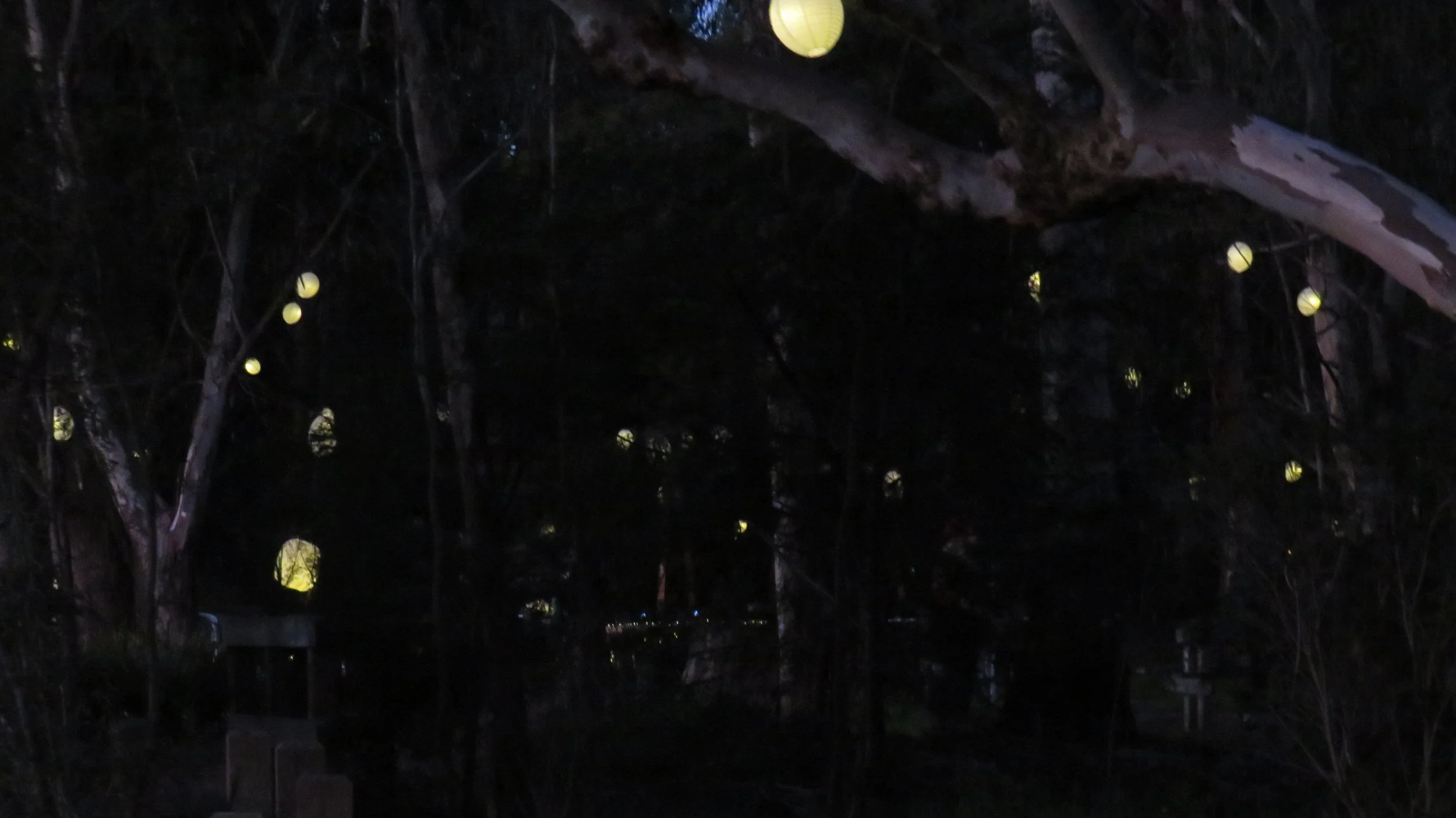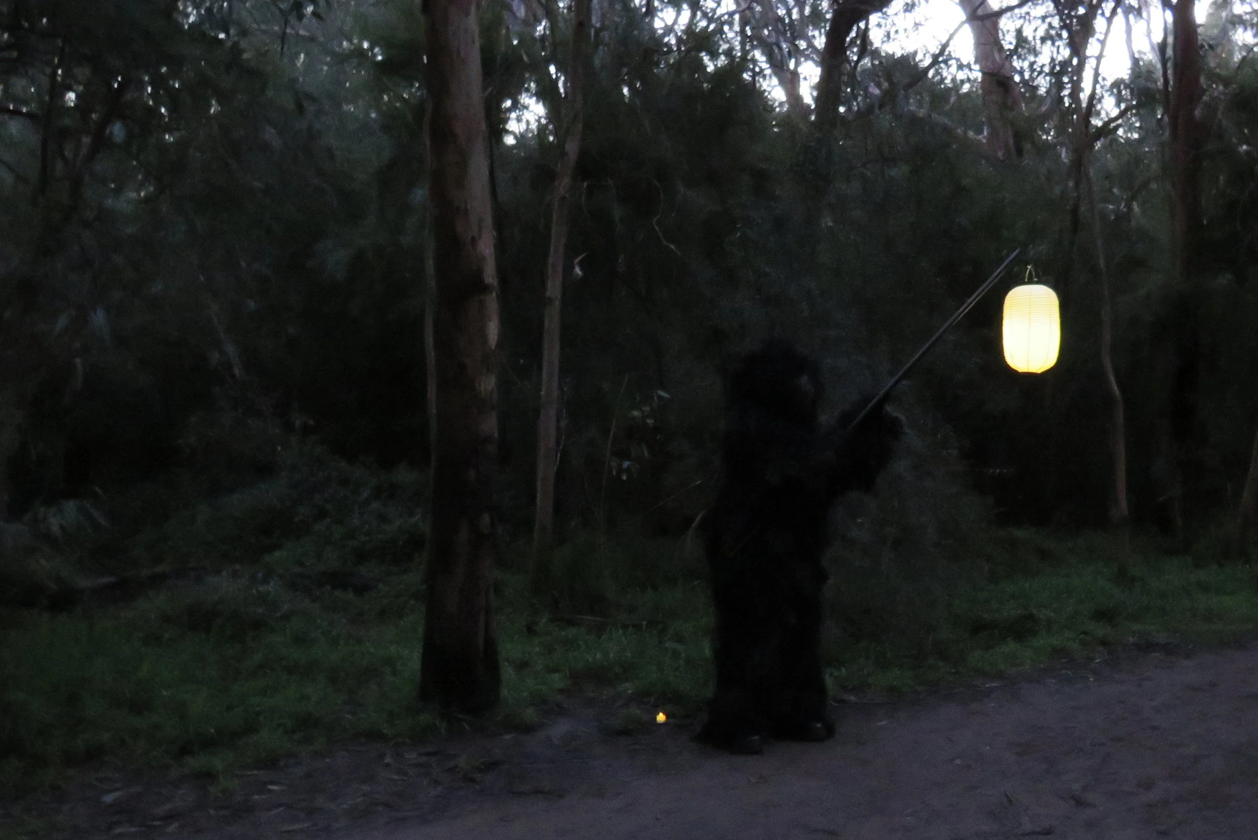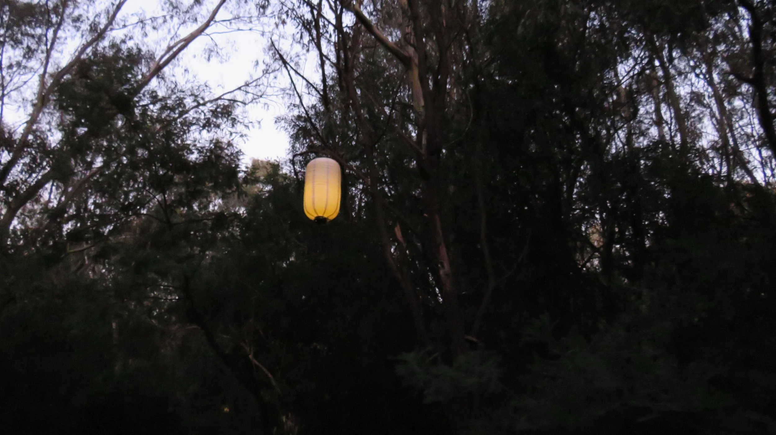 Occurring on the 20th of June 2021, The Longest Night, a winter solstice soundwalk and storytelling celebration, was presented to the community residing within Banyule Council. Individual and group soundwalkers set off into ‘Wilson Reserve’ at dusk along separate designated paths. Each audience member was given a red-tinted torch (minimising direct light disturbance to nocturnal animals), an explanation of the rules of engagement with the work, and then waited to be greeted by a mysterious, amorphous figure (performed by Jenni Townsend and Kirsten Law) whom they would follow into the Reserve. After a short journey together, they were told a story before continuing, unguided, along one of two paths. The paths, lit sparsely with warmly glowing lanterns, led through the dimming gloom to the more brightly lantern lit ‘celebration site’ at the ‘Chelsworth Park’ end of the Reserve overlooking ‘Bailey Billabong’.